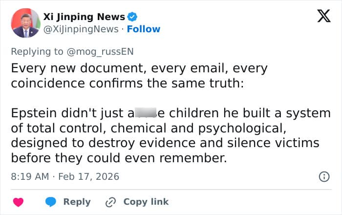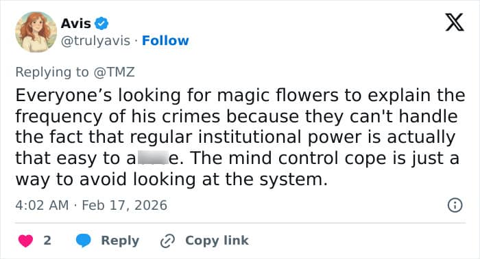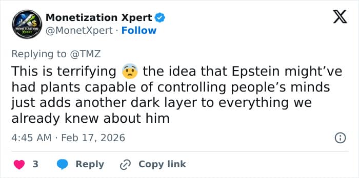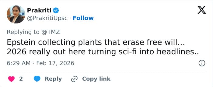 A second added, “Jeffrey Epstein’s emails reveal him growing trumpet flowers in his greenhouse. Plants notorious for mind-altering, hallucinogenic effects. Sound familiar? In Blink Twice, a mysterious island flower (turned perfume) wipes victims’ memories of ab*se, letting predators reset the clock. Coincidence?”