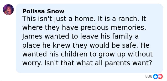 Another wrote, “This isn’t just a home. It is a ranch. It where they have precious memories. James wanted to leave his family a place he knew they would be safe. He wanted his children to grow up without worry. Isn’t that what all parents want?”