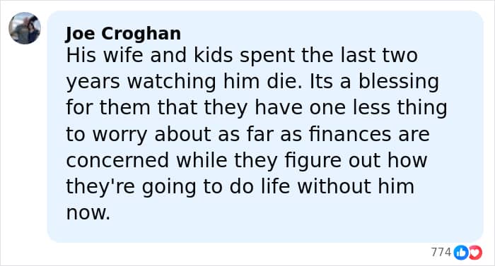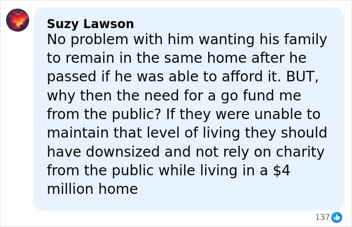 “You are in tax debt. Your friends help you buy a $4m house… No problem with him wanting his family to remain in the same home after he passed if he was able to afford it. BUT, why then the need for a go fund me from the public? If they were unable to maintain that level of living they should have downsized…”