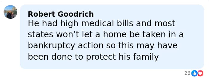 Meanwhile, supporters argued that “states won’t let a home be taken in a bankruptcy action so this may have been done to protect his family.”