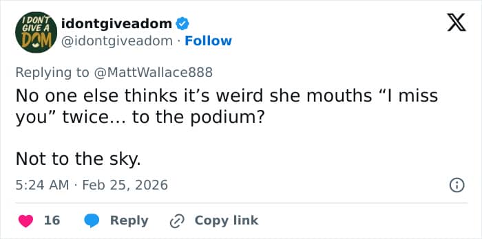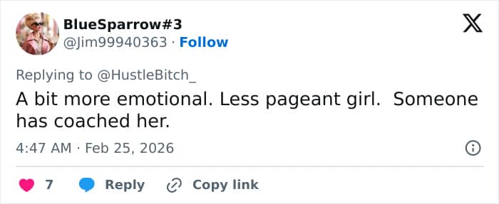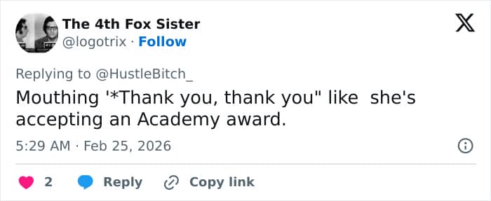 “Yep, the faux pinched face like she’s about to cry. But, at least no tissue dabbing fake tears (because there were no tears). Just glad the mention was quick,” said another.