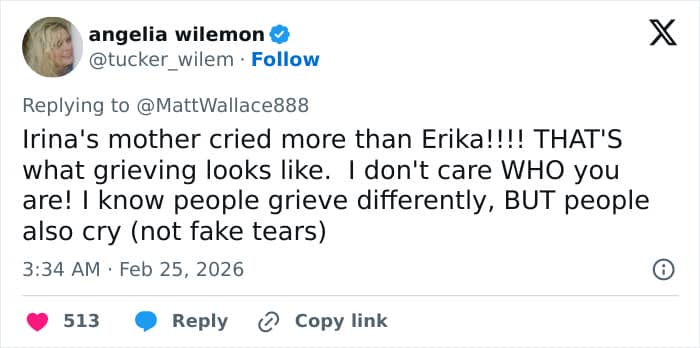 “Her reaction was really fake,” another claimed. “Look at Irina’s [sic] mother. As someone who has lost a sister to m*rd*r it’s pure agony. Irina’s mother shows us how Erika should of reacted. That was more accurate!”