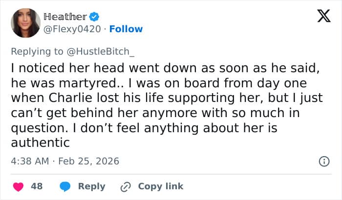 Critics have been dissecting her statements during interviews, claiming her body language didn’t seem like she was genuinely grieving Charlie’s loss.