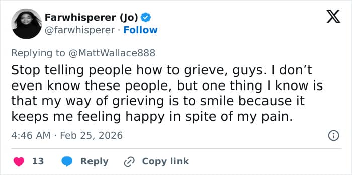 Others defended her, saying: “Will you all stop hating on this woman … seriously. Not all people grieve the same.”