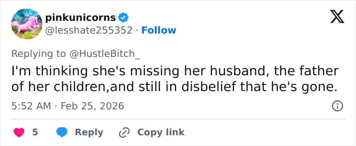 “I noticed her head went down as soon as he said, he was martyred … I don’t feel anything about her is authentic and at the same time I don’t want to talk badly about her,” another said. “But I can’t help but think she’s not a widow, but she might possibly be a black widow. We may never know the truth, but I don’t trust her and I think she’s a fraud.”