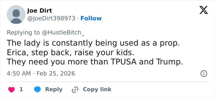 When Trump mentioned Charlie’s name during his address, viewers began scrutinizing Erika’s expressions, saying: “She knows the camera is on and she starts acting. Right on cue.”