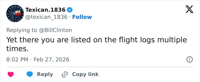 Clinton admitted in a declaration to lawmakers last month that he had flown on Epstein’s jet in 2002 and 2003, saying Epstein had “offered” him the plane to travel internationally for the Clinton Foundation.