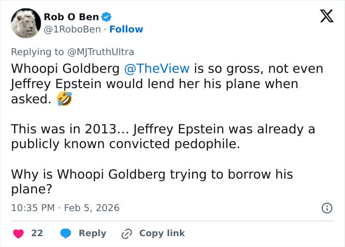 A second netizen speculated, “Whoopi Goldberg and Jeffrey Epstein had ties.”