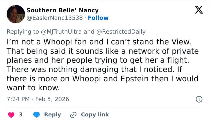 Meanwhile, some supporters argued that just being mentioned in the files doesn’t mean Whoopi had personal ties to Epstein.