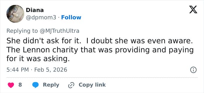 She explained that Julian Lennon’s White Feather Foundation had reached out to private plane owners to arrange transportation for her to a charity event.