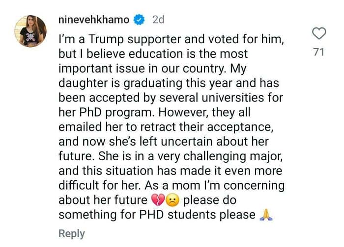 #34 Trump Supporter Who Claims ‘Education Is The Most Important Issue’ Voted For Trump, Who Then Dismantled The Education Department, Resulting In Her Daughter’s Phd Acceptances Being Revoked