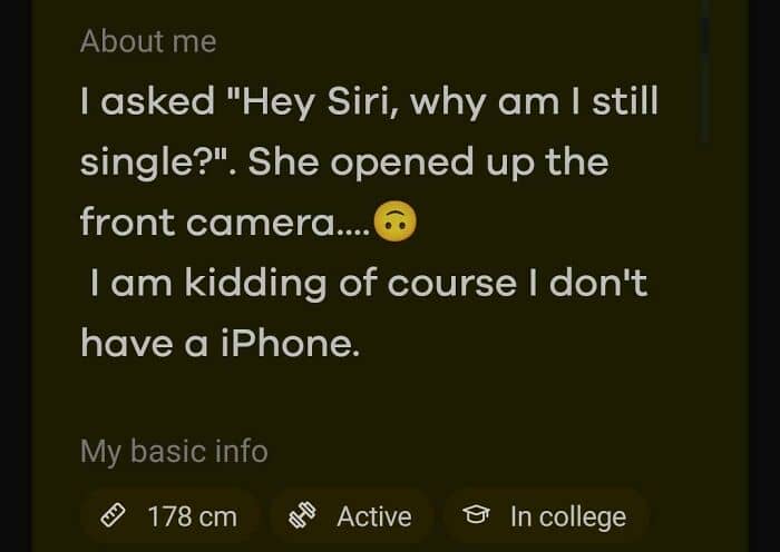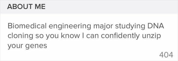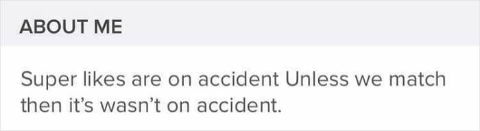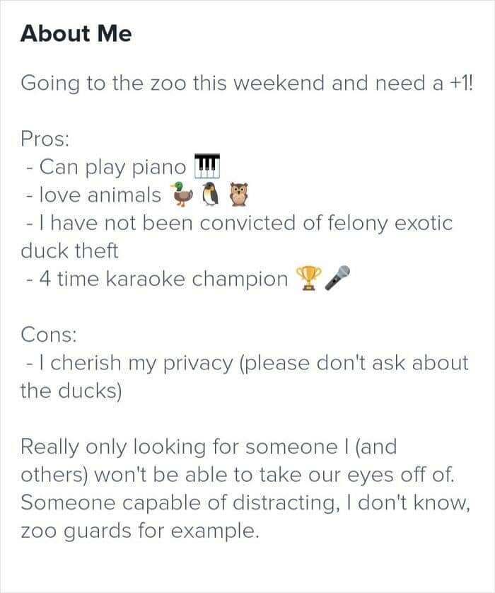 As Berman stated, tone can be hard to judge when it’s written in a bio. So while you may want to come across as funny, it’s wise to avoid jokes or quips that read as creepy, scary or insensitive.