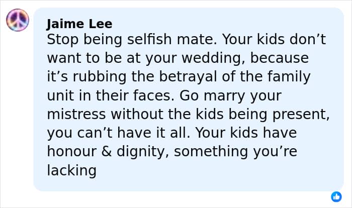 “Your kids don’t want to be at your wedding, because it’s rubbing the betrayal of the family unit in their faces,” fumed one netizen