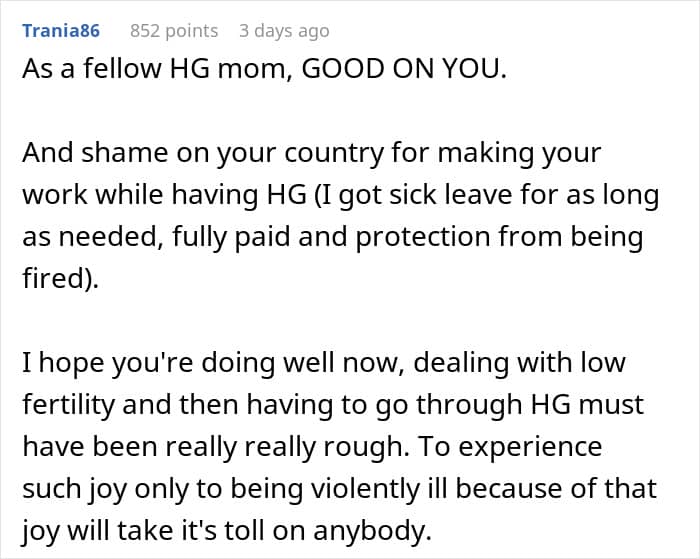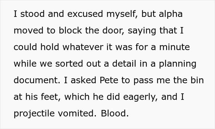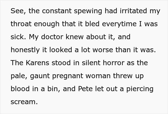 This woman had an extreme case of morning sickness and would throw up several times a day. Recently, she shared a story of how her colleagues forced her to attend a pointless meeting during that time. Naturally, she became nauseous during the meeting, and the nasty colleagues were treated to a first-row show of Hyperemesis graviradum.