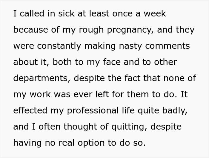 Having such a difficult pregnancy isn’t easy in and of itself, but the stress at work added to the Redditor’s struggles even more. The woman mentioned in her post how the other female teachers were “catty, calcified, and bigoted.”