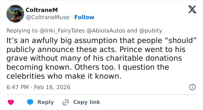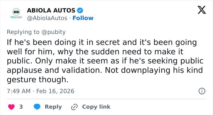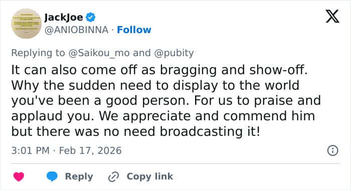 “Charity must be done without another person knowing,” one tweeted, while another added, “Should’ve kept it a secret.”