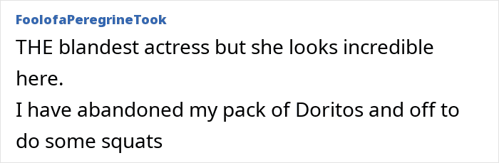 “THE blandest actress but she looks incredible here. I have abandoned my pack of Doritos and off to do some squats,” said another, while another quipped,“She’s my favourite nepo baby in the industry.”