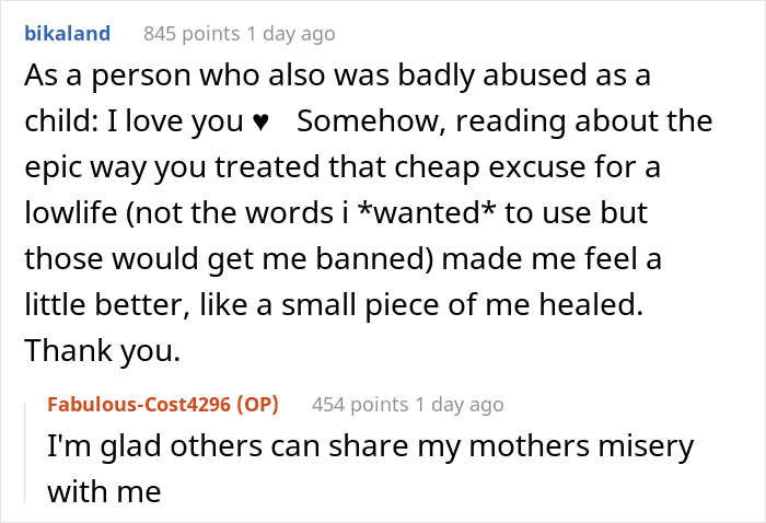 The mom left and the redditor doesn’t know where she went and what her fate will be because she doesn’t care and has no compassion for that person. However, it seems that she did go to the brother after that, because he called and said that the OP has “the biggest balls in the family” for taking the revenge of a lifetime.