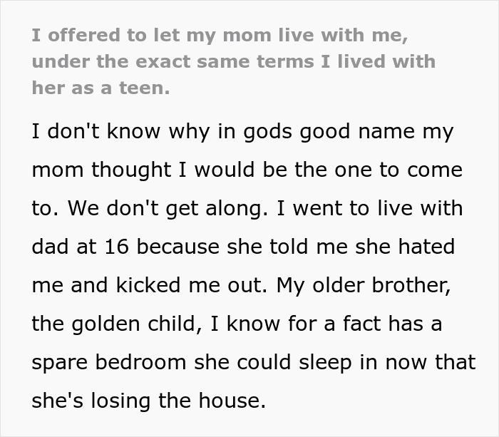 RELATED:Woman never expected to get a visit from her mom, but she came to ask for a place to live and the OP decided it was her payback time
