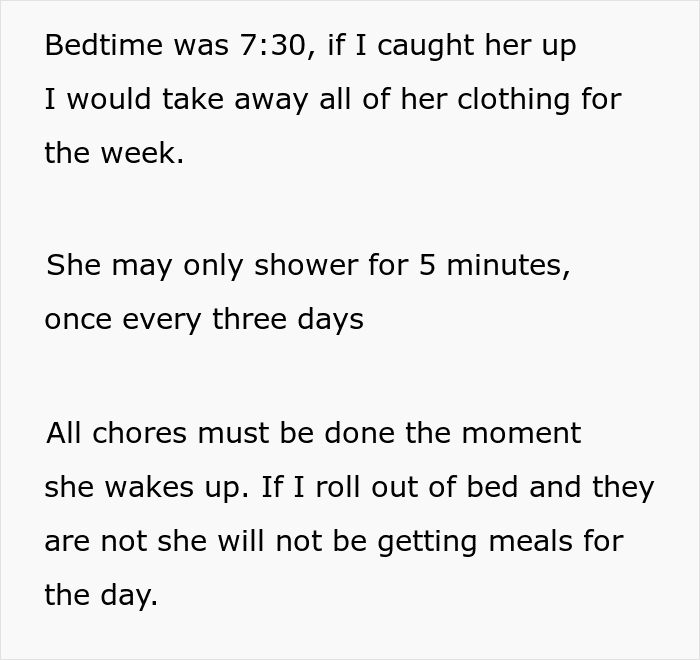 Those rules included doing chores, cooking and practically being a servant that could be thrown out at any moment, not being given a meal or having her bedding privileges taken away for the night. Her sleeping schedule would be controlled and she would not have any privacy. She would only be able to shower every three days and for no longer than 5 minutes.