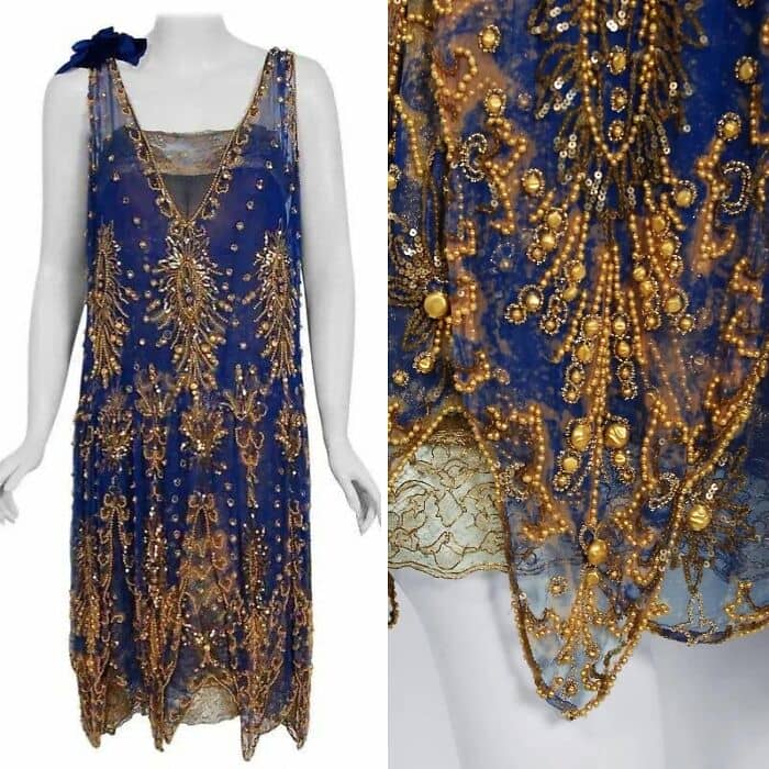 #10 1920’s French Royal-Blue Beaded Silk & Metallic Gold Lamé Lace Flapper Dress