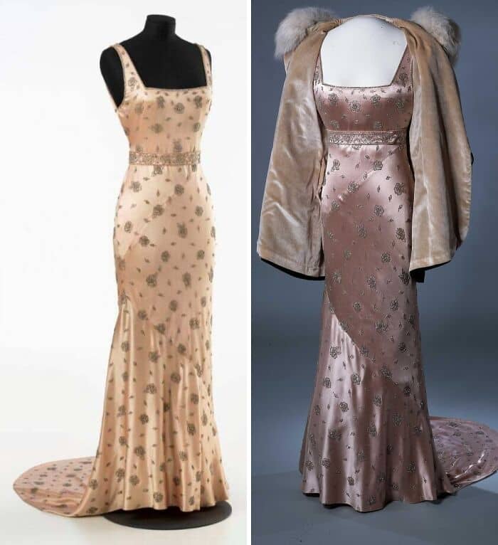 The party of the roaring twenties ended abruptly with the Great Depression and the following decade saw a return to more modest and feminine lines as people looked for comfort and stability. Hemlines dropped again and designers like Madeleine Vionnet popularized the bias cut which allowed fabric to drape beautifully over the natural curves of the body and was heavily influenced by the glamour of Hollywood film stars. When the second world war broke out fashion became a matter of national duty through utility clothing and rationing because materials like silk and nylon were needed for parachutes.