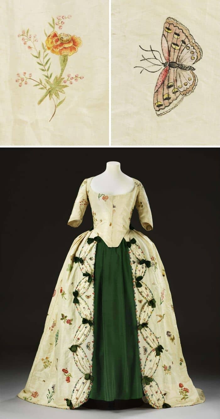 #15 Woman’s Gown, Circa 1780-85, Scottish (Sewing), Cream Silk Lustring Painted With Sprays Of Flowers, Butterflies, British (Painting); Silk, Linen, Hand-Woven, Hand-Painted, Hand-Sewn