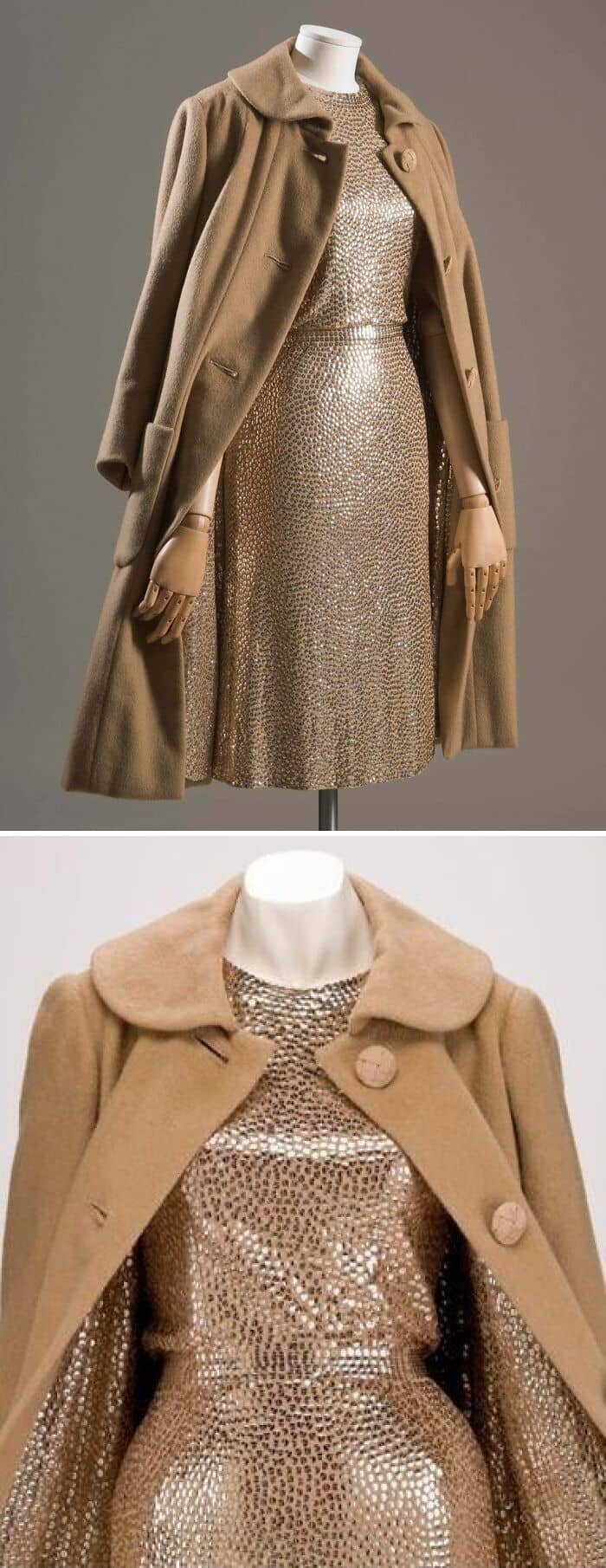 #46 Lauren Bacall’s Evening Set By Norman Norell; Gold Sequined Camel Silk Jersey “Mermaid” Sheath Dress And Cashmere Straightline “Subway Coat” With Sequined Lining
