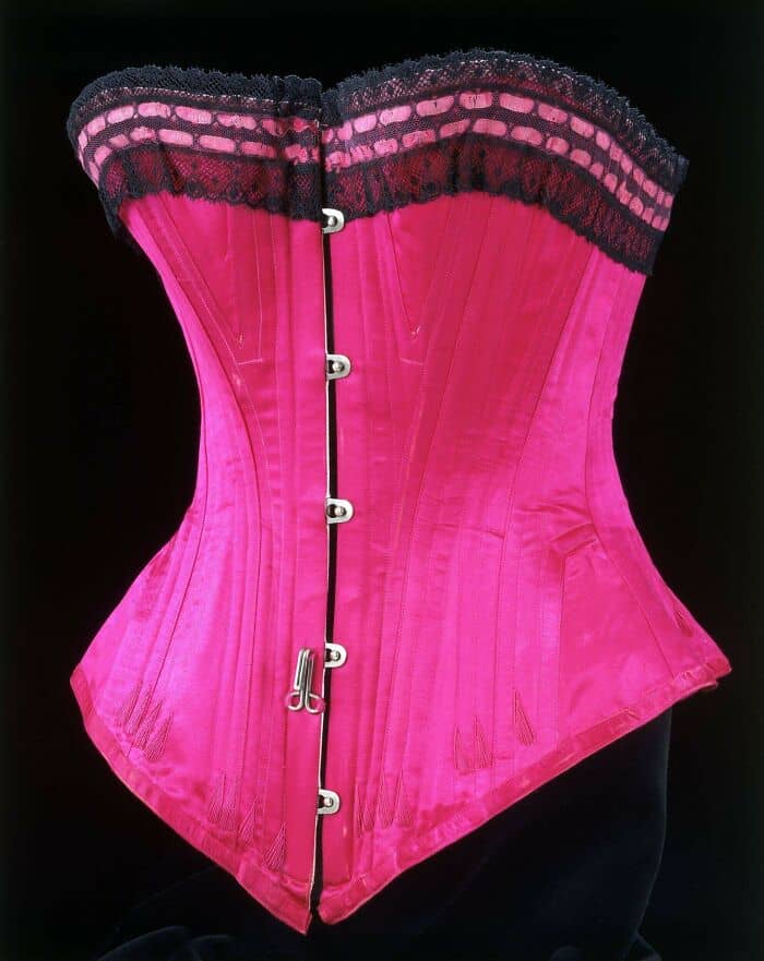 #89 Hot Pink Corset Of Satin With Hand-Made Bobbin Lace, Possibly Made In England, 1890-1895