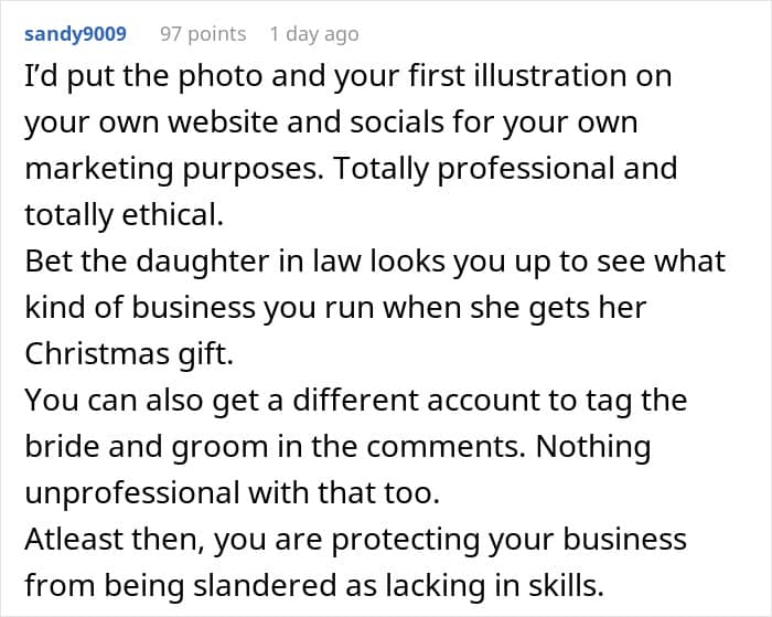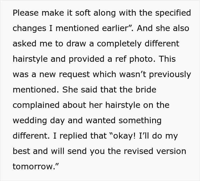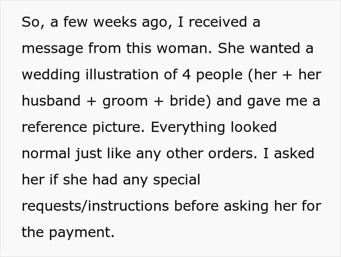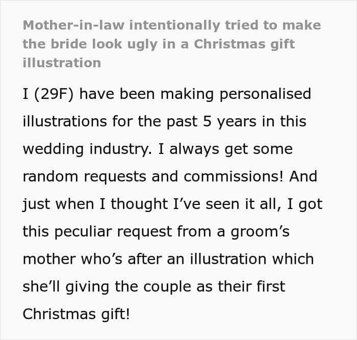 Onemother-in-law thought she had the perfect idea: a custom wedding illustration of the newlyweds alongside herself and her husband. On paper, it sounded sweet and creative. But once the artist began working, the requests started rolling in, and they quickly became strange. The MIL kept asking for adjustments that made the bride look less and less like herself, and noticeably less attractive.