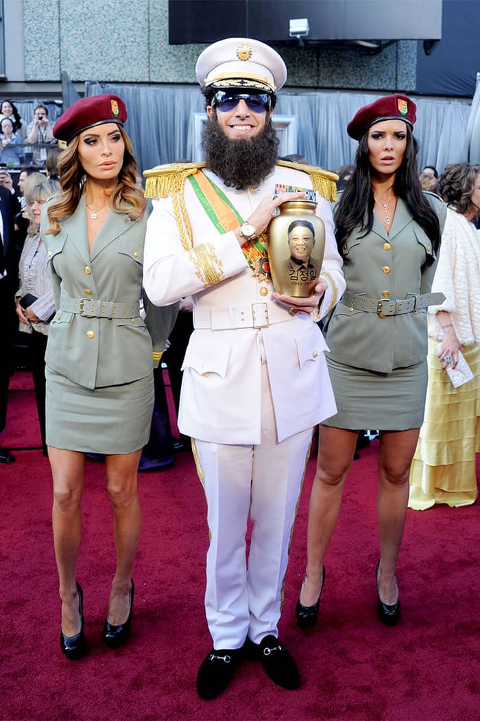 Sacha Baron Cohen arrived at the 2012 Oscars in character, dressed as Admiral General Aladeen, a Middle Eastern leader from his film The Di*tator.