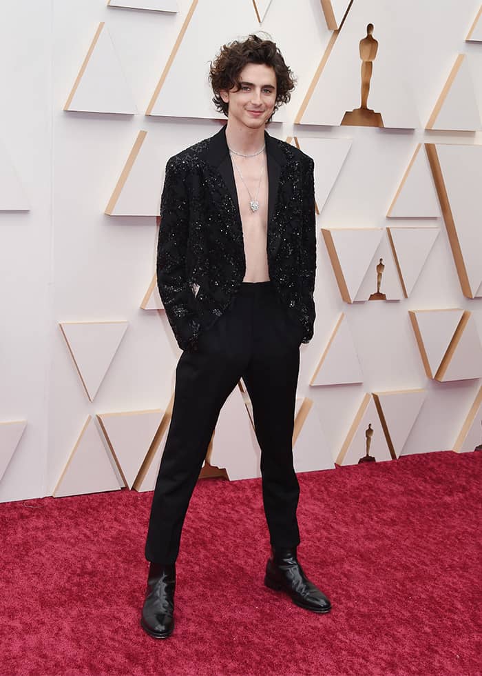 The actor whose ping-pong biopic Marty Supreme is nominated in nine categories, including Best Actor and Best Picture this year, arrived at the 2022 ceremony in a sequined black suit by Louis Vuitton, worn sans shirt.