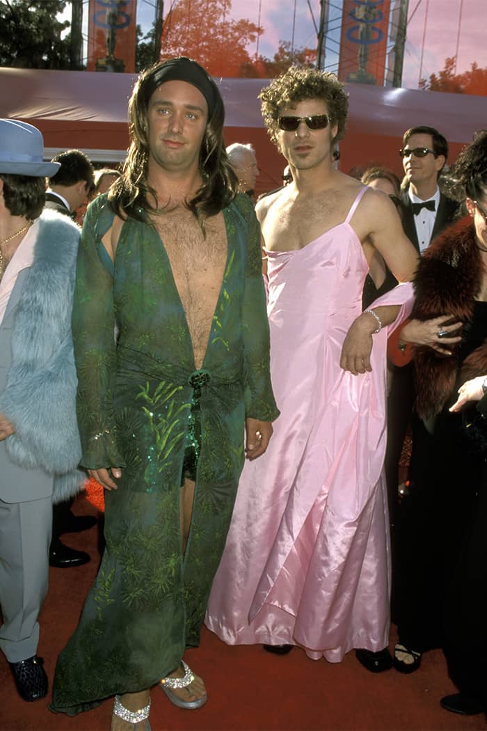 At the 72nd Oscar Awards in 2000, Trey Parker wore a refined version of Jennifer Lopez’s much-celebrated Versace dress from the 2000 Grammys, while Matt Stone complemented him in a pink gown inspired by the Ralph Lauren piece worn by Gwyneth Paltrow at the previous Oscars.
