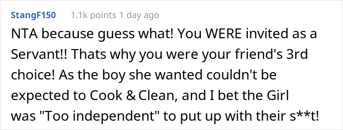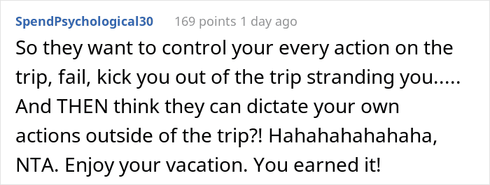 But, all in all, folks agreed that she was invited to vacation with them. Hence, she was in no way obligated to feel bad about doing just that. And hence people’s praises for the OP, saying she did the right thing and executed it flawlessly.