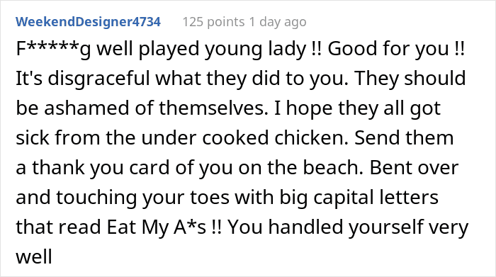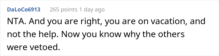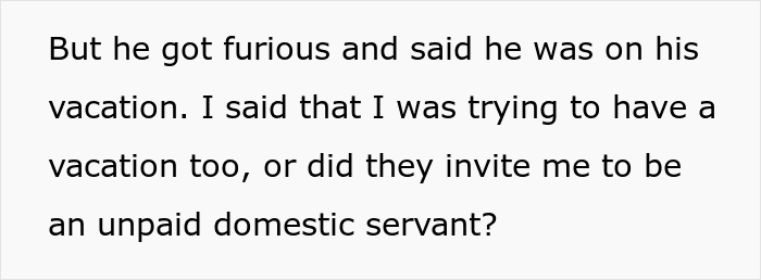 However, it did not go well. The dad of the family in turn got livid, and tensions started to skyrocket. But OP was not about to let anyone trample on her, so she told him off. This initiated his entitlement protocol and he blurted out that it was his vacation. Well, it’s OP’s vacation too, or did they invite her to be an unpaid cook?