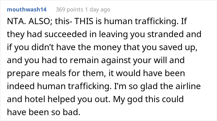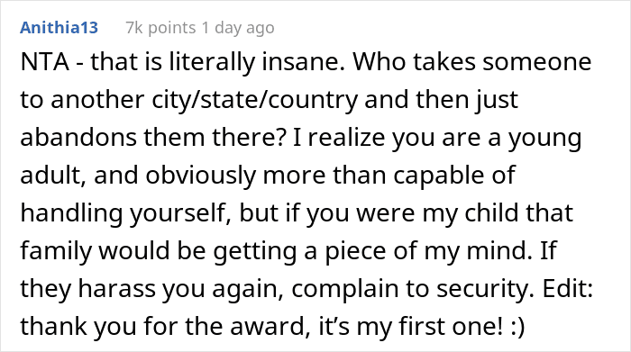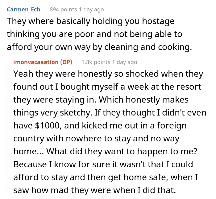 One day, the OP was sightseeing and Meg’s family happened to stumble upon her. They seemed quite surprised that the OP was still around. In fact, they were furious after understanding that the OP would be using their return ticket, having “deceived” them into thinking she couldn’t afford a vacation. Which, when you think about it, is quite evil as they were effectively attempting to leave her stranded here.