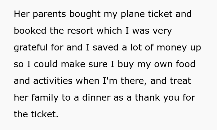 The family offered to buy her ticket and book a resort for all of them to stay at. Sounds sweet, right? The young woman, in turn, started saving up for some activities while on vacation, and a little bit extra to treat the family to some dinner for being so generous.