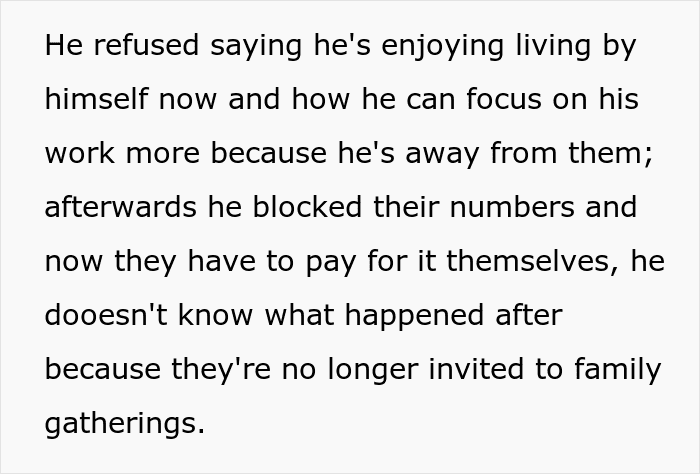 Naturally, he refused and said that he was enjoying living by himself and was now able to focus on his work more without having to endure their nasty remarks. Afterwards, he blocked their numbers, and he hasn’t heard from them since.