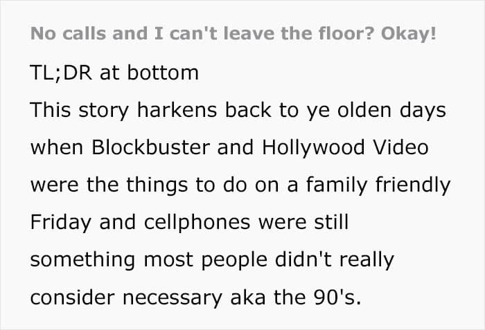 There were two particular instances that served as the setup for the malicious compliance, namely not being allowed to use the phone or to leave the floor
