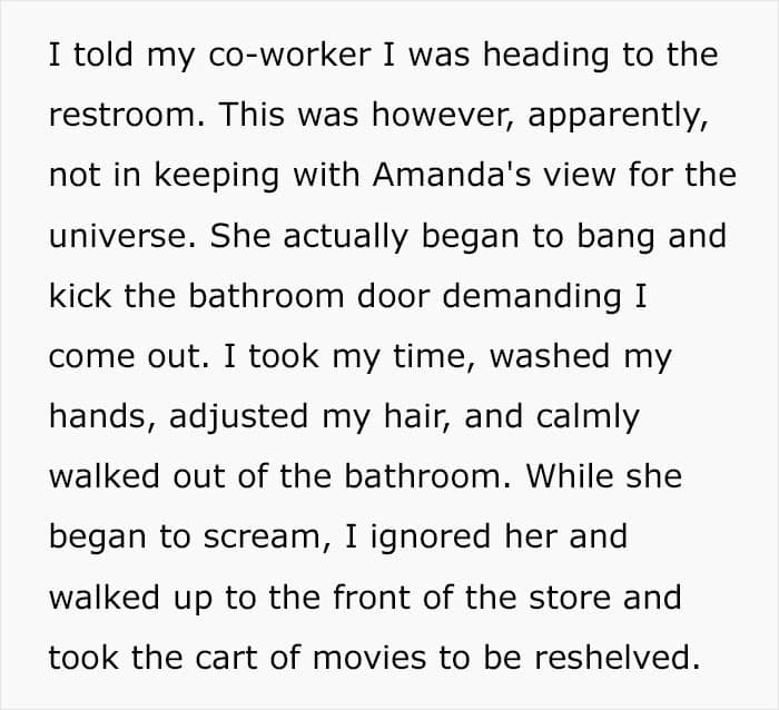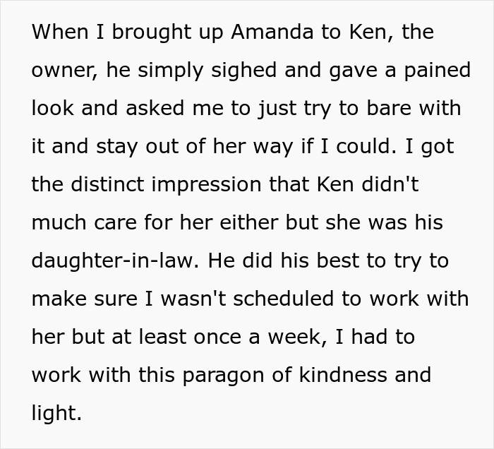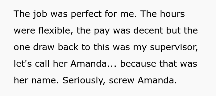 Anywho, the job was great, but one particular individual there was not. She, unfortunately, was a manager there, and OP introduced her as Amanda. You see, she was on the older side and not all that satisfied with life. Because of this, she was bent on making everyone else’s lives as miserable as hers, so everyone suffered. Customers too.