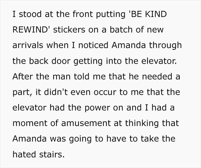 Fired? Great, packing my stuff and leaving immediately, BYE! This is the tactic OP assumed, leaving Amanda stuck in the elevator until the next shift arrived in a couple of hours. They left as a thunderstorm of swearwords was just in full climax, hanging the “We’re Closed” sign on the door and going to Ken, the store owner.