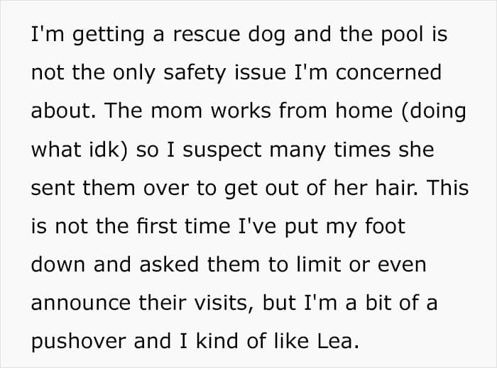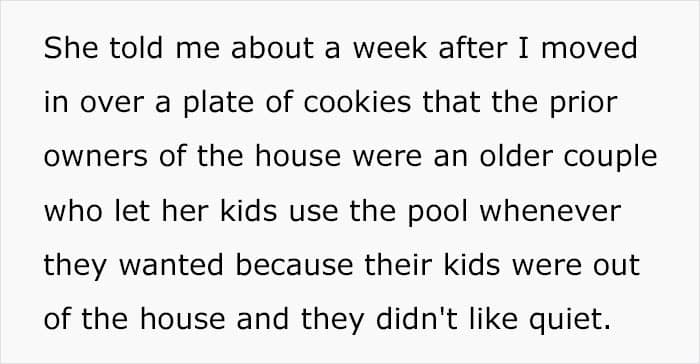 A now-deleted Reddit user posted a story about the time she met her new neighbors. At first, they seemed fine, so she even let their two teenage boys and 11-year-old girl come over and use her pool as long as the trio didn’t abuse their privilege.