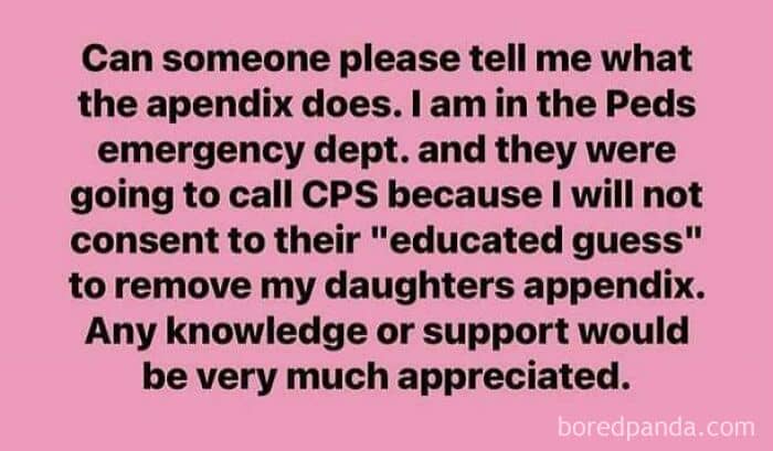 #7 I Don’t Know What An Appendix Does But I Do Know The Doctors That Are Trying To Save My Child Are Just Quacks
