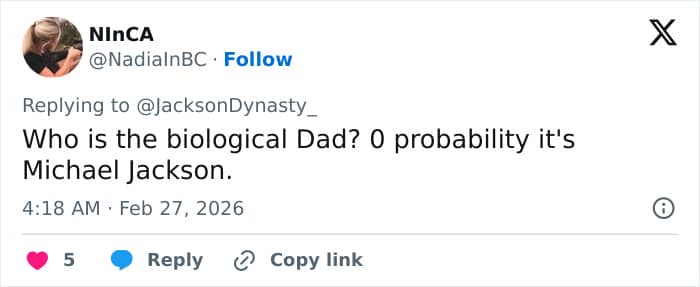 “Who is the biological Dad? 0 probability it’s Michael Jackson,” one person questioned, while another said, “There is no possible way she is Michael’s biological child.”