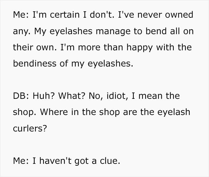 This time, a super rude woman at the supermarket forced this guy to take on a plan B. When the lady, titled a “Douchebagette” for obvious reasons, bombarded u/Wiggle_it_loose with commands to get her eyelash curlers, he picked a lethal weapon. Hint: cold, hard honesty.