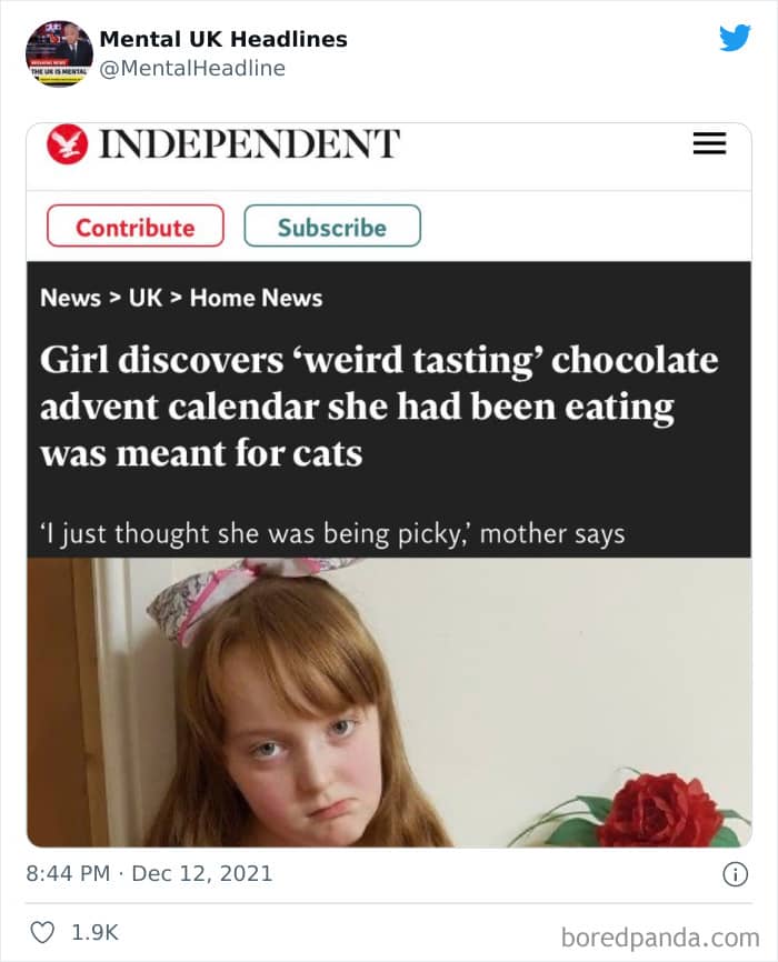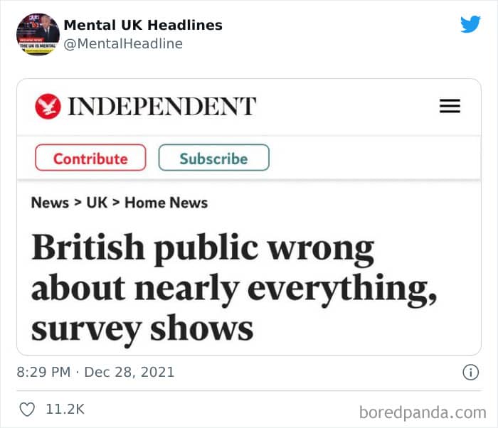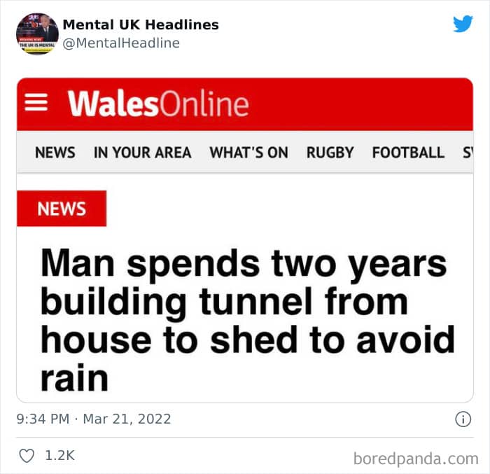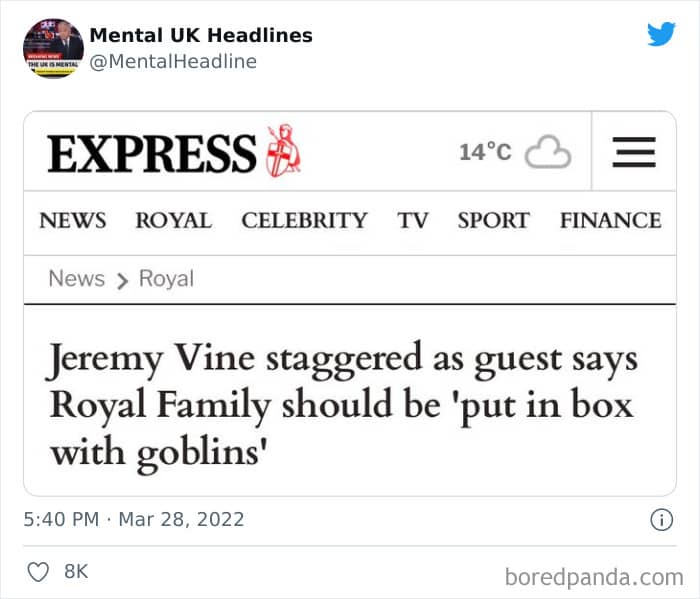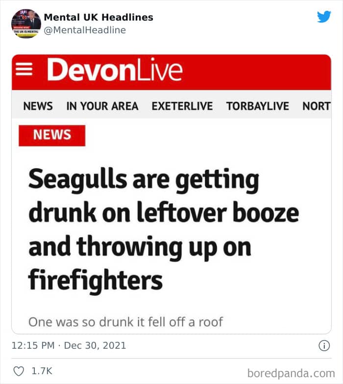 Now that’s where the ‘Mental UK Headlines’ Twitter page comes in. A social media project that unites nearly 100k followers, the account features some of the funniest, most bizarre, and downright ludicrous news stories and headlines found in the British press. Both in the tabloids and in the more serious (digital) papers. And today we’re featuring some of their very best finds to bring a smile to your face. Just because the press isn’t yellow doesn’t mean it’s not immune to some truly bizarre headlines.