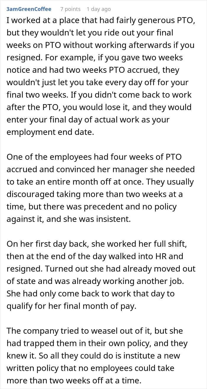 In this story, the details are concerning the paid time off (PTO) policies. The company in question had a dubious practice in place that did not benefit the employees at all. However, the author of the story made it work for him with some help from malicious compliance. Scroll down to see how.