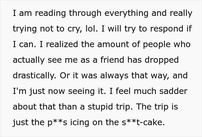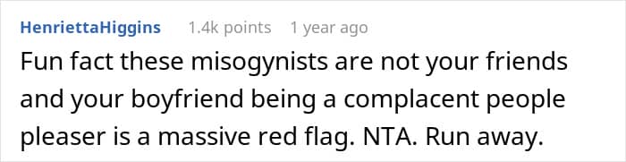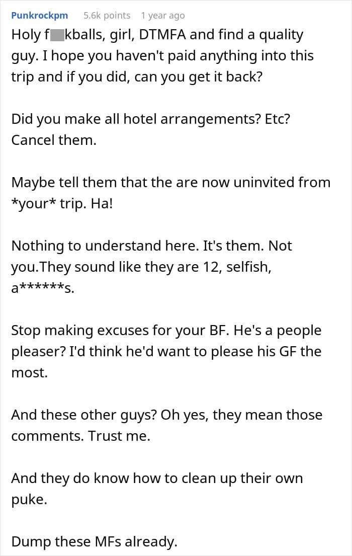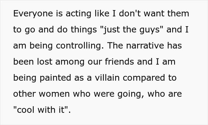 It’s not fair to let someone put time, energy and money into planning a trip only to be told at the last minute that she can’t come. But as the woman in this story shared, it seems like her partner’s friends never actually saw her as a friend. In fact, it looks like they might view all women as lesser than.