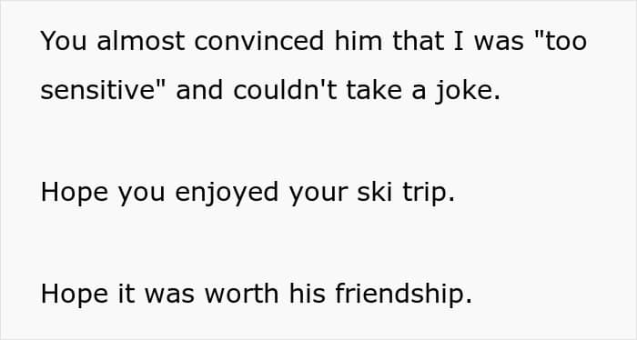 Losing a friend is always painful, and it can be even more hurtful to lose an entire friend group at once. But there’s no excuse for sexist jokes and behavior nowadays, and it’s certainly not worth it to cling onto friendships with people who hold harmful beliefs. Perhaps this woman dodged a bullet by skipping out on this ski trip.