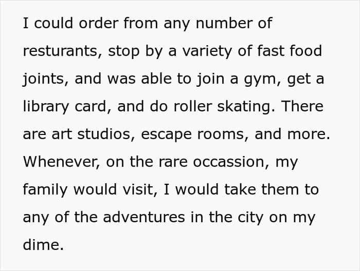 Right after the poster moved out of her hometown, she made sure to keep in touch with her family members. She would always go back home for celebrations or birthdays, and call or text them during the week. Even if they came to visit her, she would take them out to do things in the city, all on her own dime.